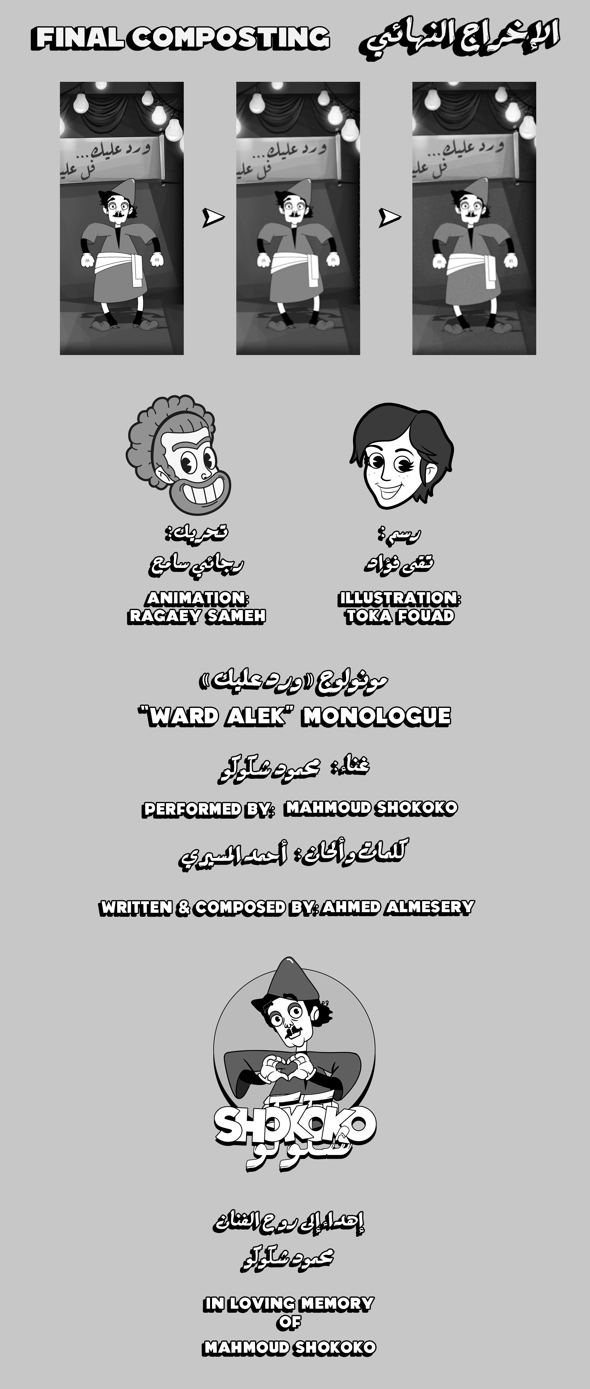 Mahmoud Shokoko is one of the most famous singers in Egypt and the Arab world. He has many songs and monologues, and “ward Aleik” is one of his most famous monologues. In this video we used part of the monologue to make a simulation of the classic animation movies such as “Meshmesh effendi” the very first Egyptian animation, and Disney classics by following their old rubber hose style in both the drawings and the animation. الفنان محمود شكوكو هو واحد من أشهر المغنيين الشعبيين في مصر و العالم العربي، عنده مونولوجات و أغاني كتير من أشهرهم مونولوج " ورد عليك". في الفيديو ده أخدنا جزء من المونولوج و عملناله محاكاة للرسوم المتحركة الكلاسيكية زي مشمش أفندي (أول رسوم متحركة مصرية)، و أفلام ديزني القديمة من حيث الرسم و طريقة التحريك اللي كانو مستخدمين في بداية القرن اللي فات.